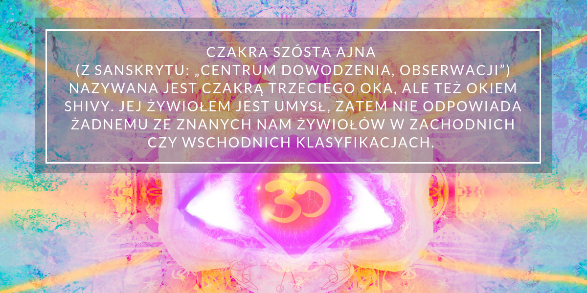 Masz kłopoty z koncentracją, zapamiętywaniem? Często działasz na tzw. autopilocie? Nie ufasz swojej intuicji i uważasz, że nie jest najlepsza? Wizualizacje przychodzą Ci z trudem? Cierpisz na bóle głowy, zatok? Masz trudności z przewidywaniem konsekwencji działań? W każdej z tych sytuacji pomocna okaże się praktyka dla szóstej czakry. Czakra szósta Ajna (z sanskrytu: „centrum dowodzenia, obserwacji”) nazywana jest czakrą trzeciego oka, ale też okiem Shivy. Jej żywiołem jest umysł, zatem nie odpowiada żadnemu ze znanych nam żywiołów w zachodnich czy wschodnich klasyfikacjach. Jest na to zbyt eteryczna, zbyt subtelna. Usytuowana jest na wysokości punktu pomiędzy brwiami, wewnątrz mózgu, na samym czubku kręgosłupa. Łączy się ją z różnymi kolorami, w zależności od tradycji: fioletem, indygo czy srebrnym. CZAKRA Na poziomie fizycznym czakra trzeciego oka odpowiada za:
